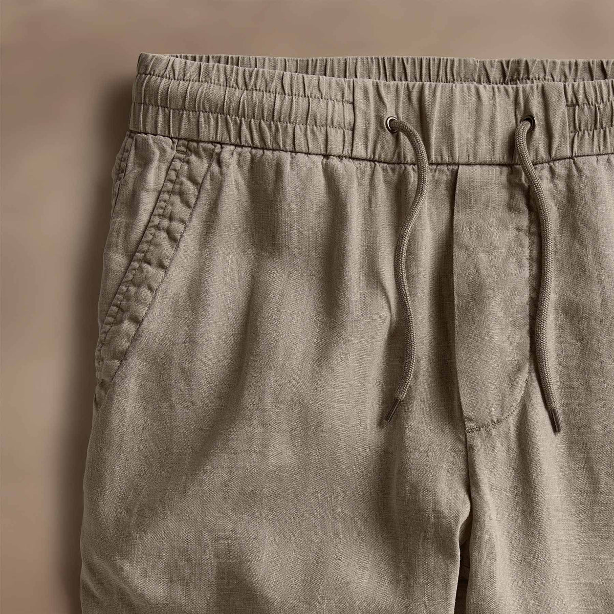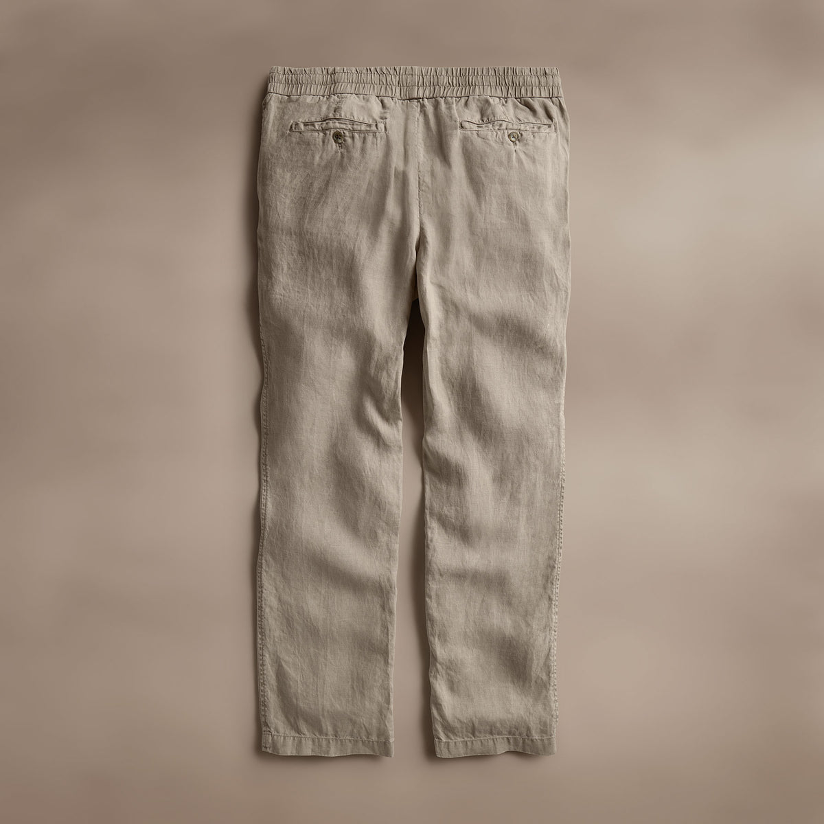 Our Relaxed Fit Linen Pant is made in a heavier version of our classic linen fabric from last year. This fabric has visible slub texture and creates high's and low's when dyed. Style details include elasticized waistband with clean panel at center front and drawcord, slash front pockets, back welt pockets, non-functional fly, and clean bottom hems. Garment dyed. Relaxed fit.