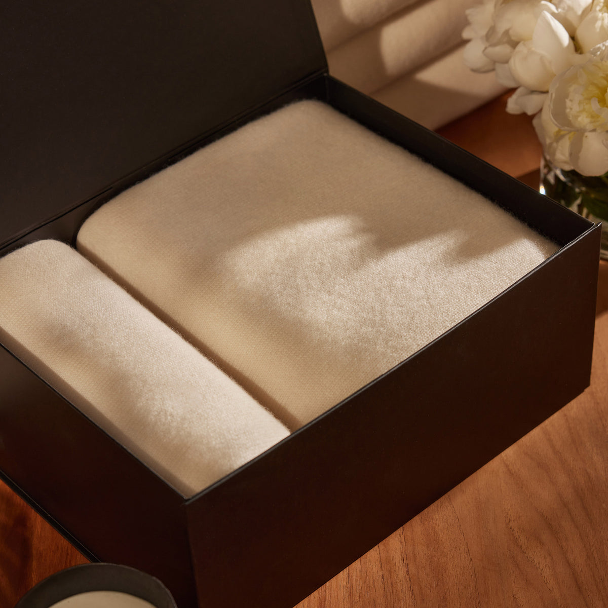 Indulge in luxury with our Cashmere Knit Blanket. Crafted from a lightweight solid jersey stitch knit cashmere, this premium throw is ideal for year-round use. Whether draped over a sofa or folded at the foot of a bed, our blanket is the perfect addition to elevate any living space. Box included.