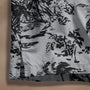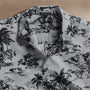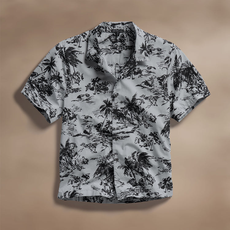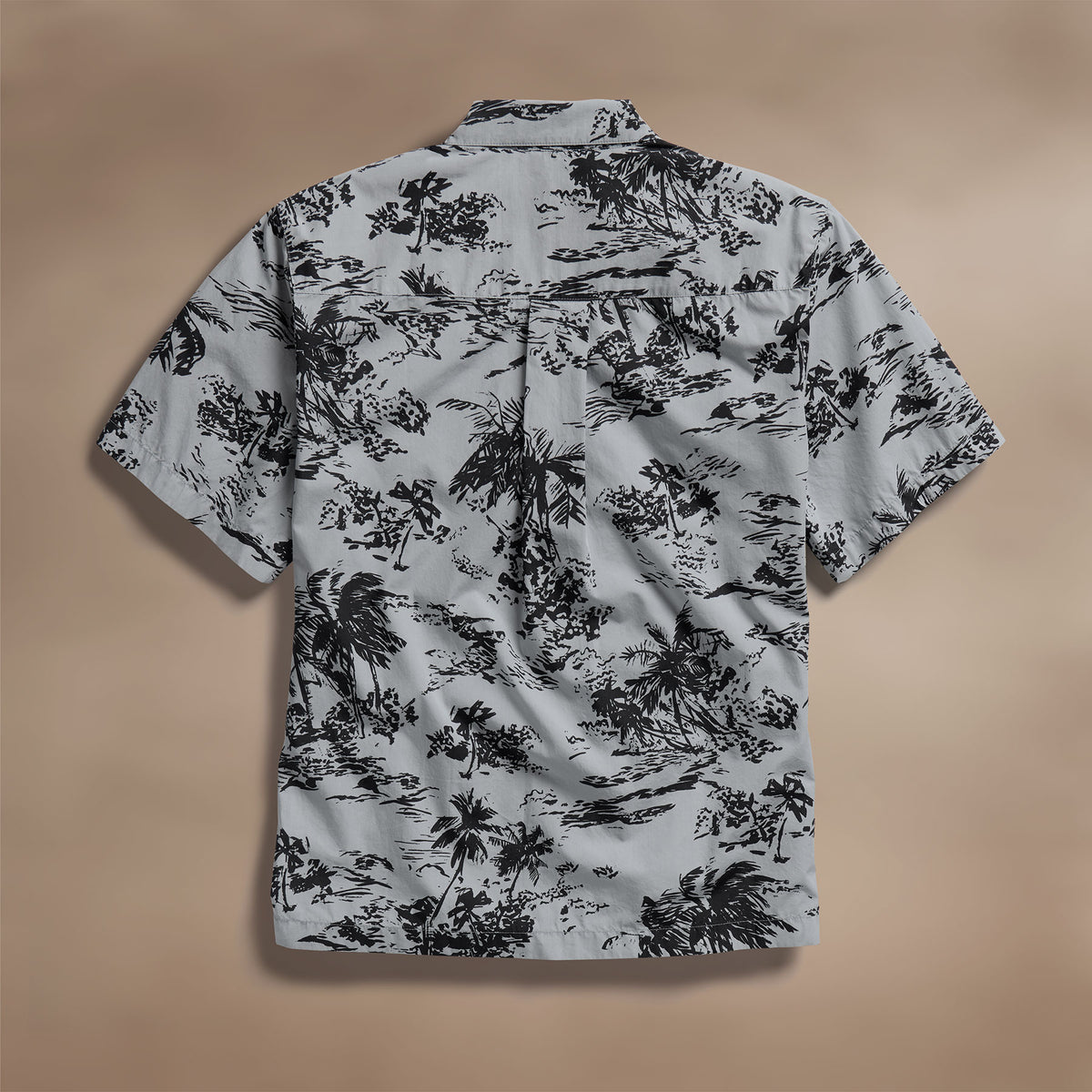 Island poplin shirt with an overdyed print. Drop collar, button front, side splits, pleat at center back yoke