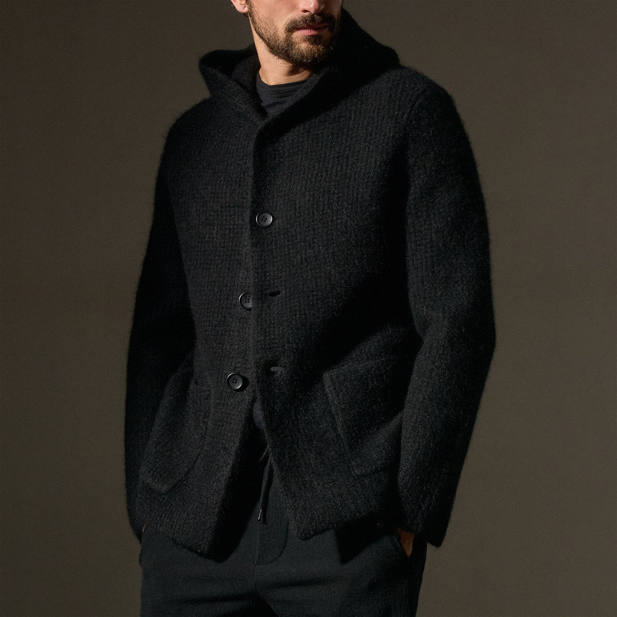 Our Chunky Waffle Knit Hooded Car Coat is made from an Italian blend yarn that is knit on a double bed machine creating a luxe soft fabrication. Style details include subtle waffle knit, button front closure, front patch pockets, hooded back. Classic fit.