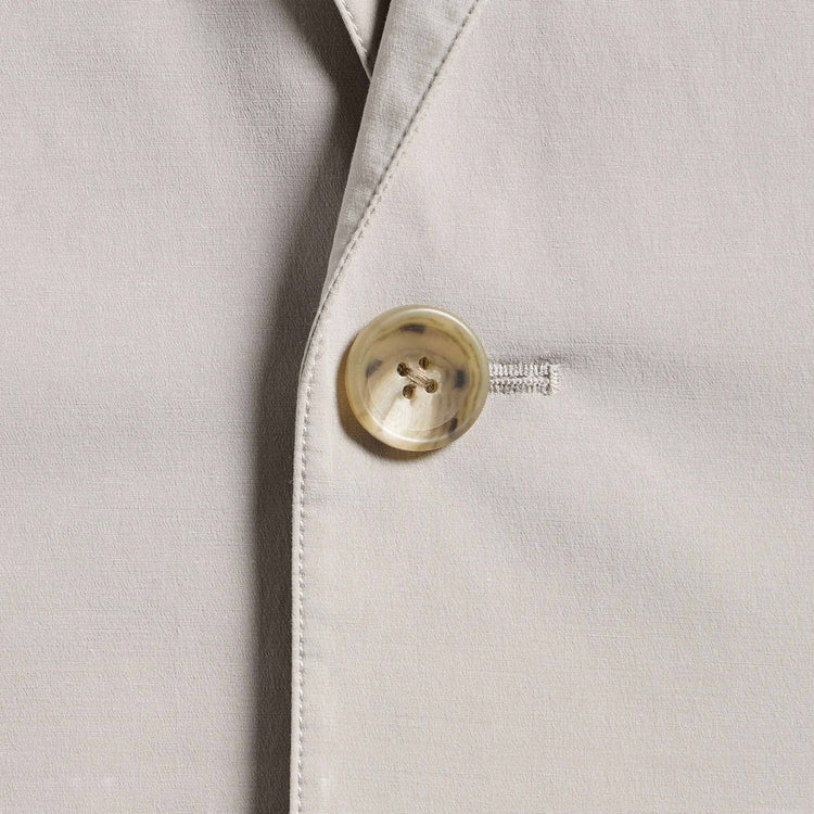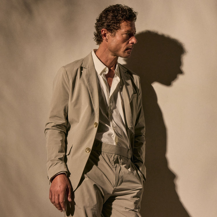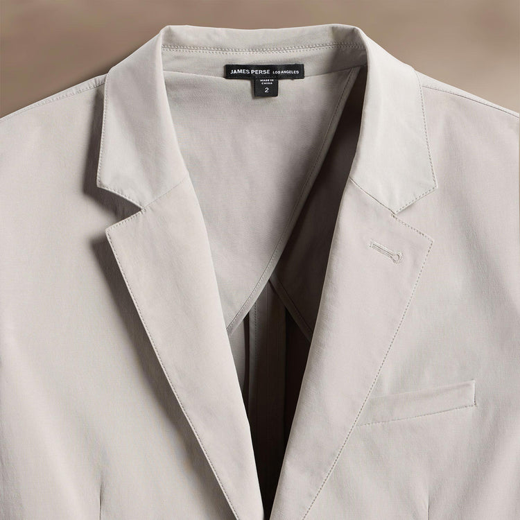 Made with an Italian cotton blend performance poplin. Classic notch collar, double fronts, two button front, clean finishes. Front patch pockets with flaps, single welt pocket at chest, back vent, internal welt pocket