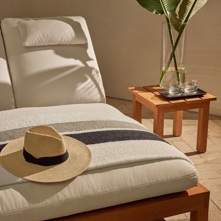 Indulge in the epitome of luxury with our generously sized, ultra-soft beach towel featuring our classic double stripe. Each towel is crafted from 100% long staple Japanese cotton. Our towels are an exceptional 720 GSM (grams per square meter), a testament to their superior plushness and absorbency. Our looped vs twisted construction enhances the towel's resilience and ensures it remains sumptuously soft. Our towels are ideal as your go-to pool and beachside accessory or can be used to refresh any bathroom or gym.