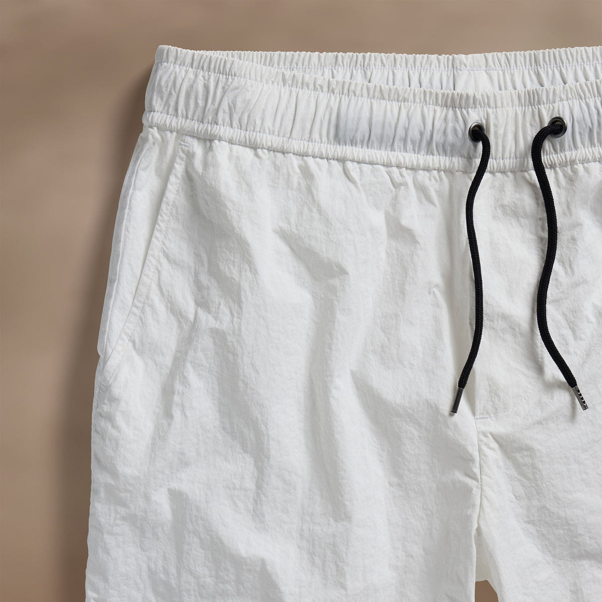 Made with a textured water resistant nylon. Elasticized waistband with drawcord, non-functional fly, side splits at bottom hem. Two front slash pockets and one back pocket with velcro closure flap