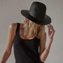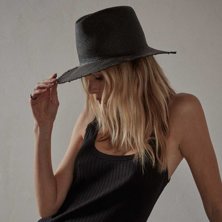 Fringed Continental hat features a pinched crown and fringe finish at brim.