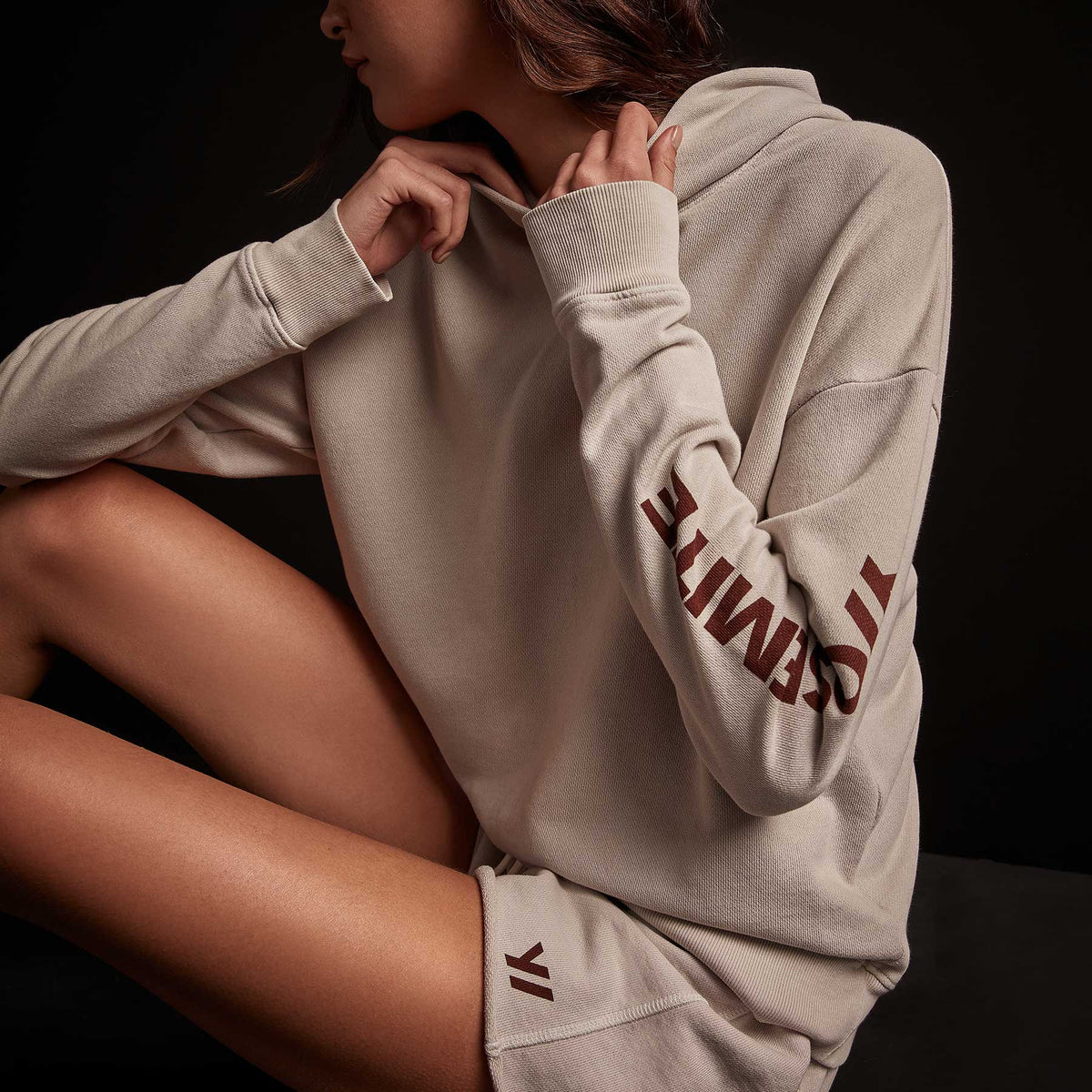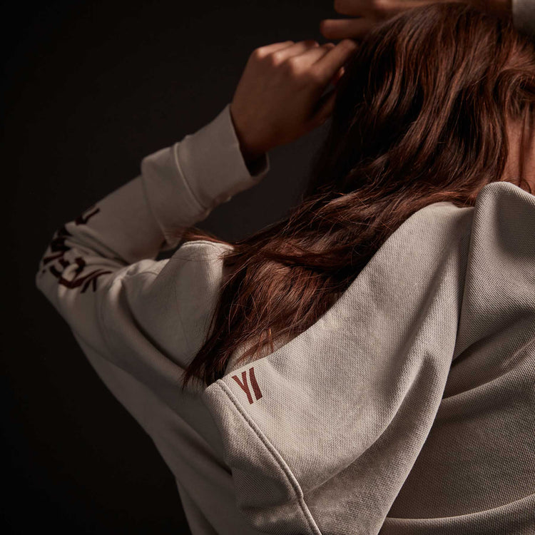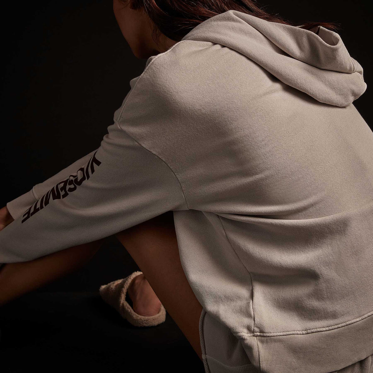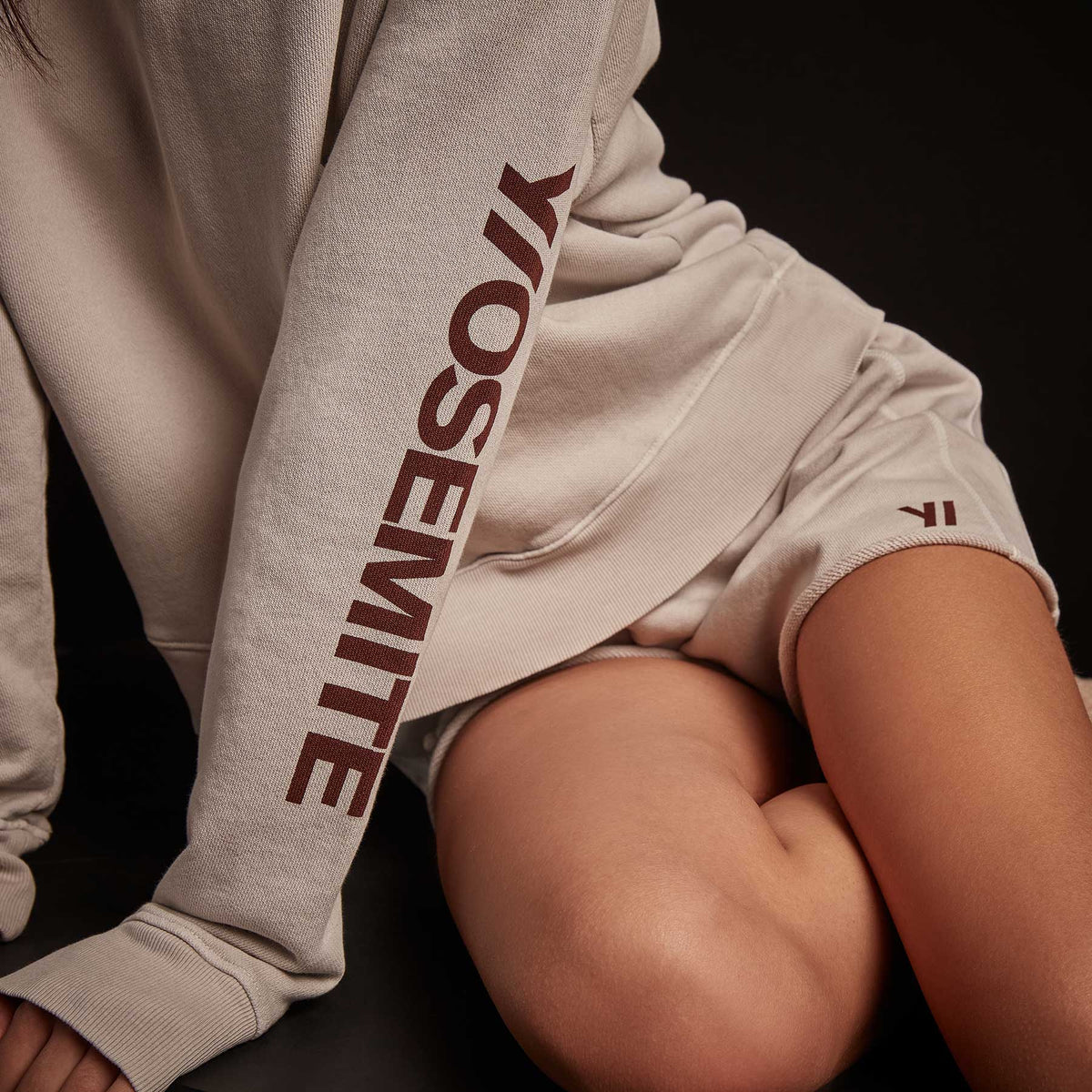 Our Y/OSEMITE Graphic Pullover Hoodie is made in a 100% long loop french terry. Style details include a double layered hood, dropped shoulder, full length sleeves with ribbed cuffs and bottom hem finished in self fabric. Y/ graphic at hood and Y/OSEMITE graphic at wearer's left sleeve. Garment dyed with extra softeners for a soft, lived in feel. Relaxed fit.