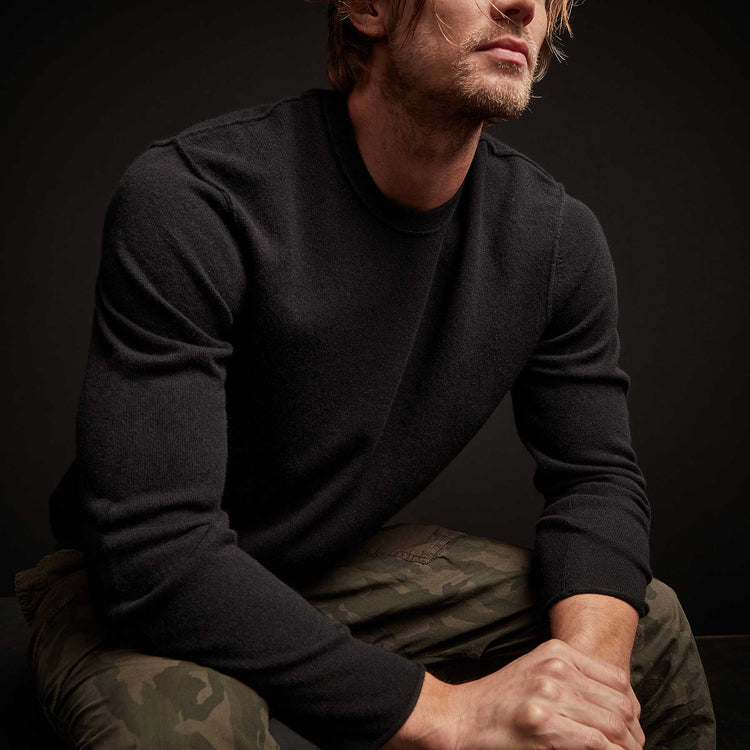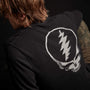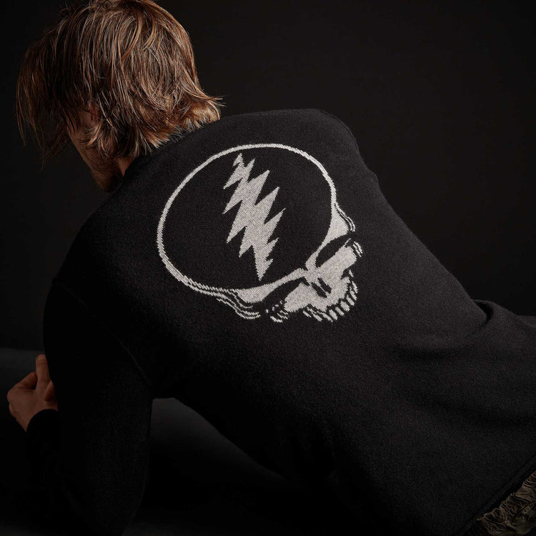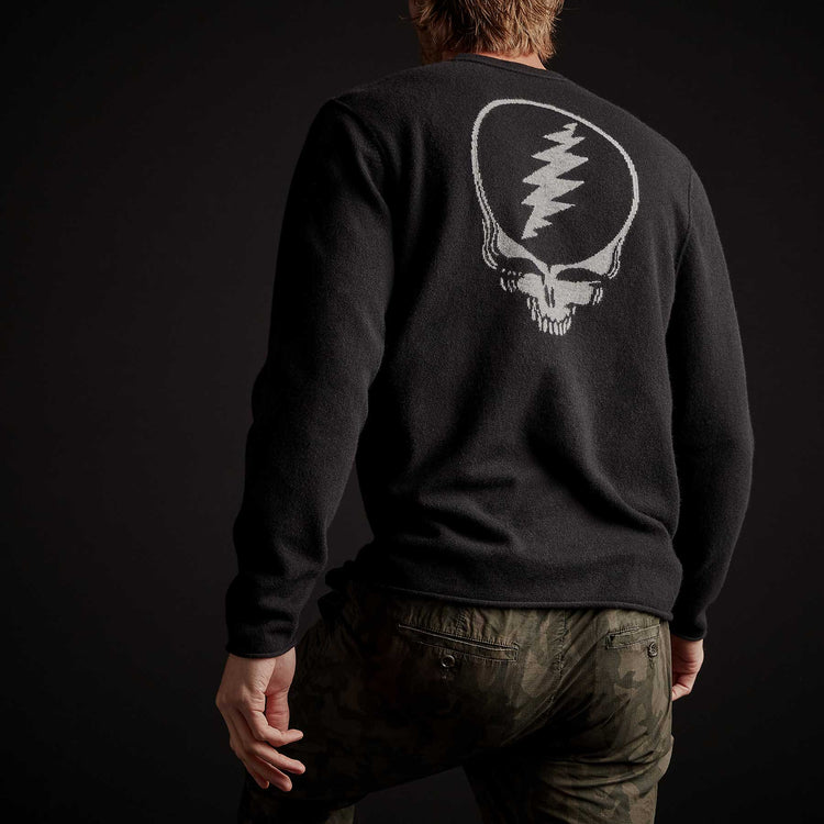 Our Recycled Cashmere Crew Sweater is made from recycled cashmere fibers. Style details include crew neckline, exposed linking at shoulders, armholes, and neck seam, self start hems. Grateful Dead skull intarsia at center back. Classic fit.