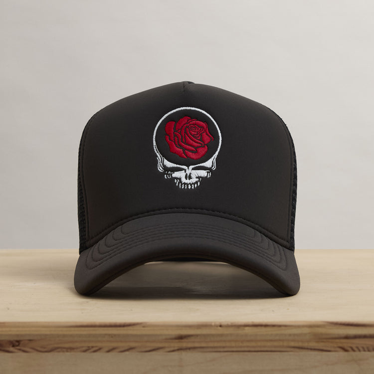 Scuba trucker hat with adjustable mesh back and features a Grateful Dead Rose embroidery