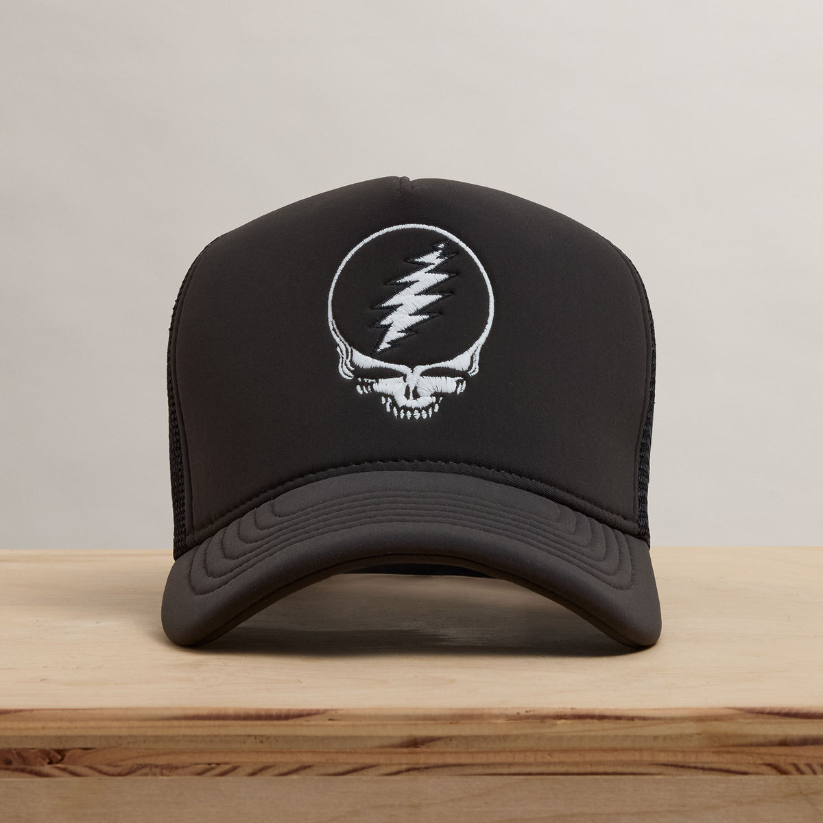 Scuba trucker hat with adjustable mesh back and features a Grateful Dead embroidery.