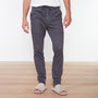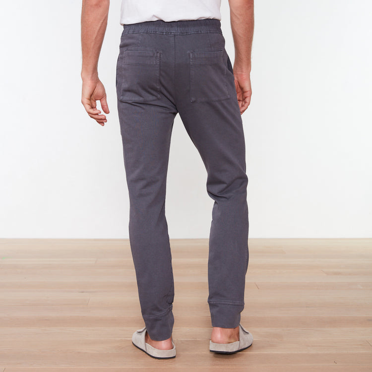Cotton Jersey Jogger Pant. Pull on elastic waistband in Rigid Jersey (DNW) fabric. External drawcord detail. Two slash patch pockets on front. Functional fly with hidden button closure. Full length tapered leg with cuff on bottom hem. Two back patch pockets with center darts. Rigid Cotton Jersey (DNW) adds structure to this relaxed jogger pant.