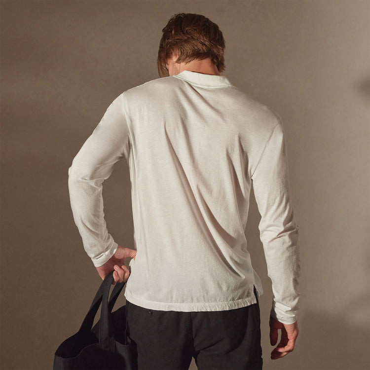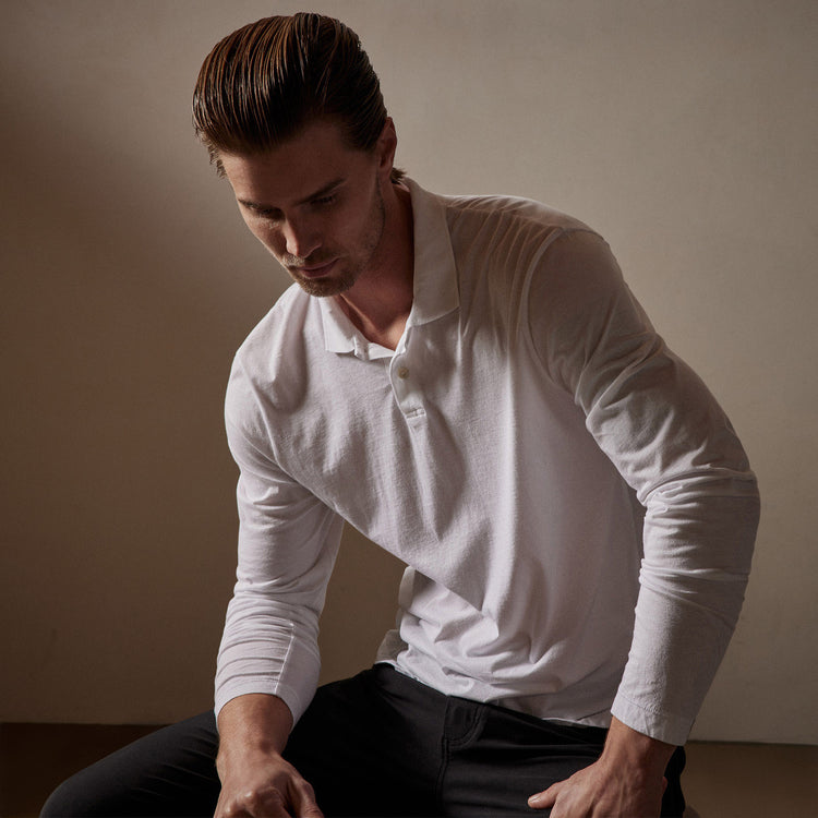 Our Elevated Lotus Jersey is made with unique luxe jersey from Japan. This fabric is incredibly smooth and ultra-soft with satin like hand feel. This polished long sleeve polo is a great day to night transition piece. Classic fit.