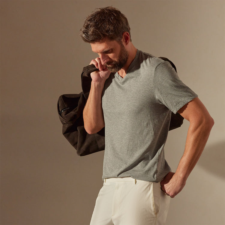 Our Luxe Lotus Jersey V Neck is made in an elevated jersey from Japan. The luxe nature of this fabric is characterized by the way the cotton is spun which gives it a clean and smooth texture that mimics an ultra soft, matte satin like hand feel. Style details include an inset v neck trim, short sleeves and clean finished hems. Slim fit. For a more relaxed fit, sizing up is recommended.