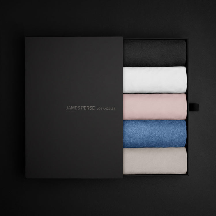 Men's assorted color t-shirt gift set, presented in a custom James Perse box.
