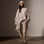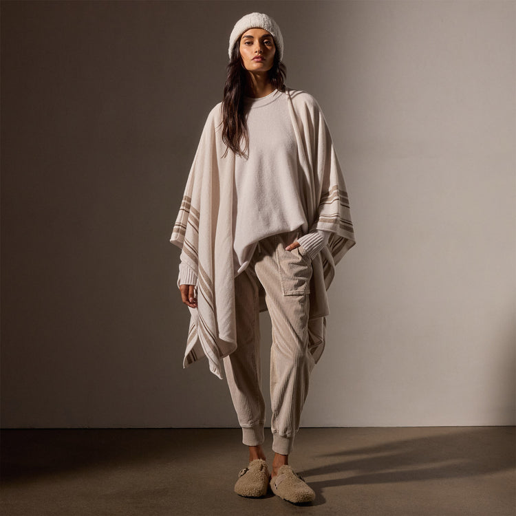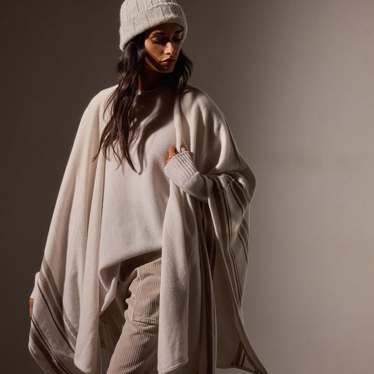 Our Recycled Cashmere Striped Poncho is made of recycled cashmere fibers. Style details include exposed linking at shoulder seams, center back seam, rolled edges.Unisex: One Size Fits Most