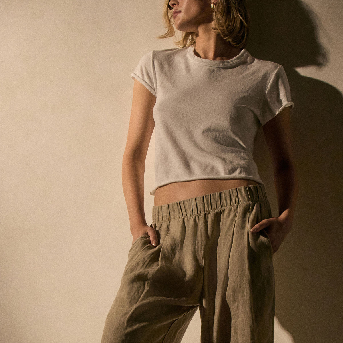 Made in Japanese jersey. Fabric is soft with a lofty gauze effect, natural slub with high's and low's. Raw edge bottom opening, binded crew neck