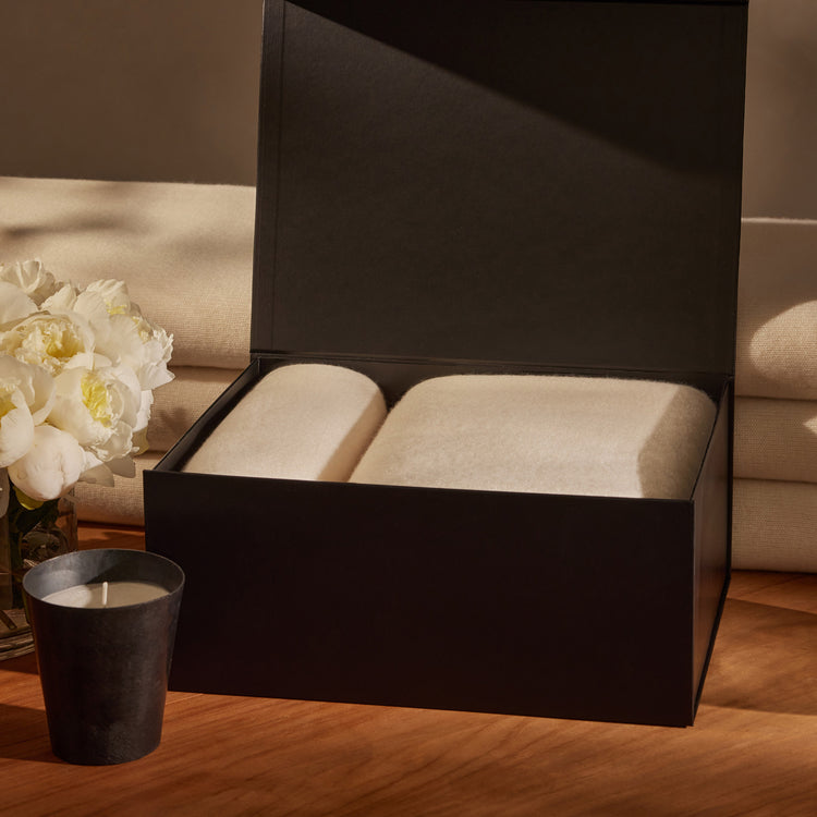 Indulge in luxury with our Cashmere Knit Blanket. Crafted from a lightweight solid jersey stitch knit cashmere, this premium throw is ideal for year-round use. Whether draped over a sofa or folded at the foot of a bed, our blanket is the perfect addition to elevate any living space. Box included.