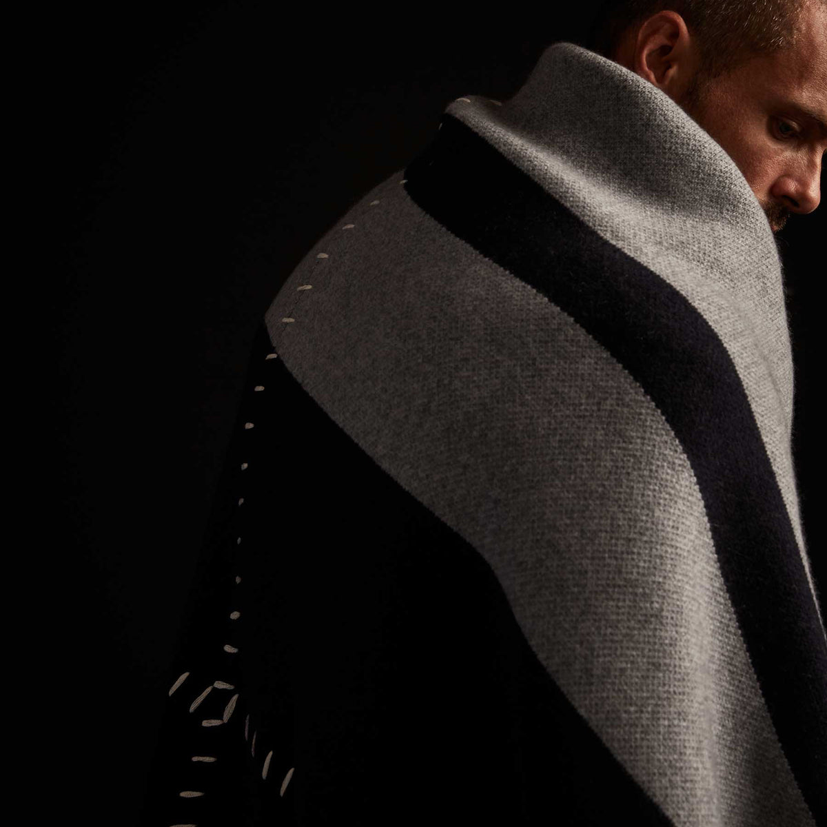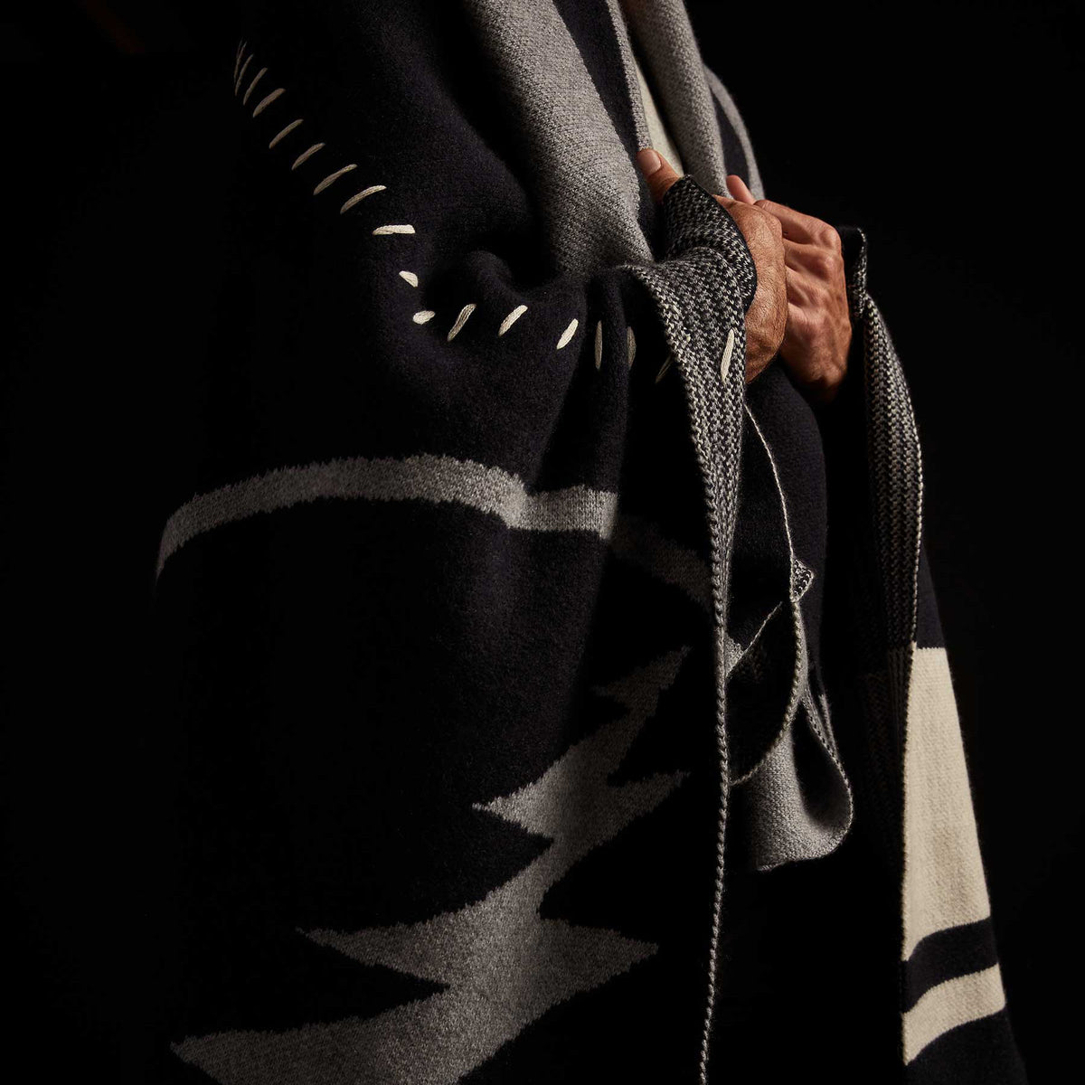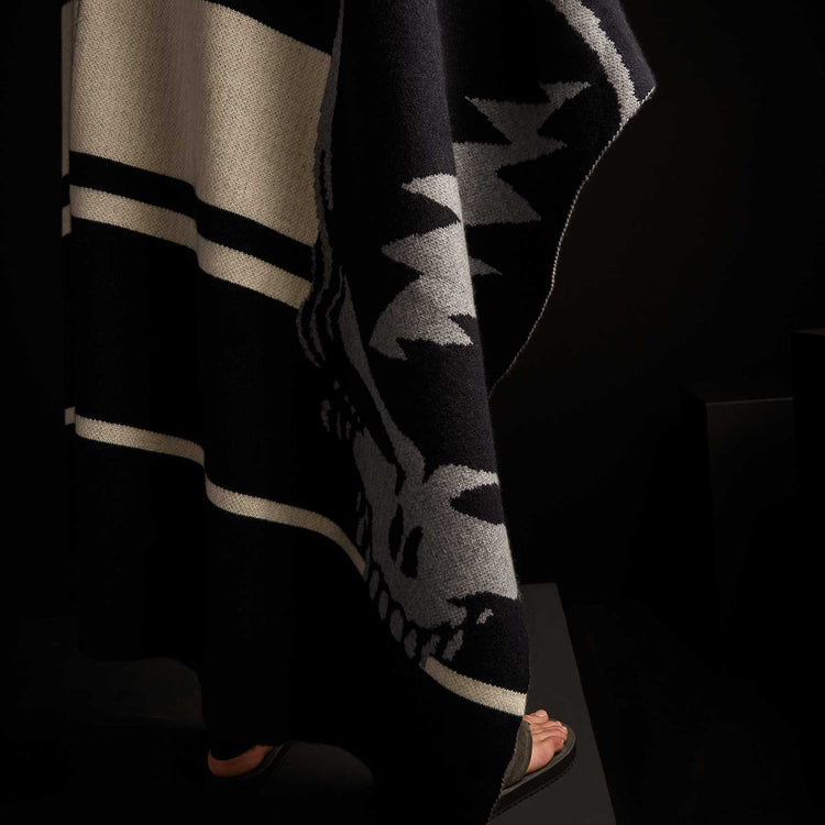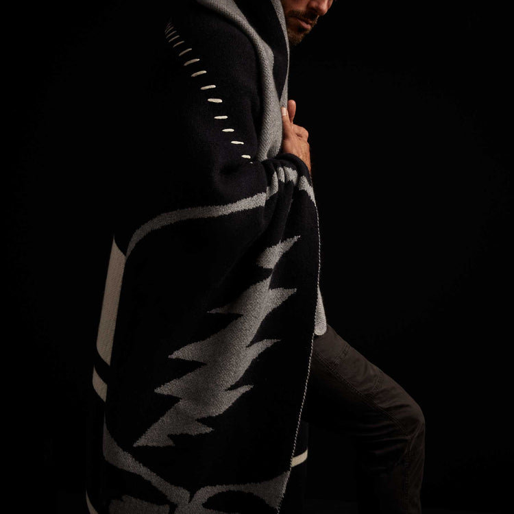Indulge in luxury with our Grateful Dead Cashmere Blanket. Crafted from double-faced cashmere knit jacquard, this premium throw features a reversable design flaunting the iconic emblem of the band, the Grateful Dead skull. This blanket is further accentuated by a distinctive patchwork detail, framed by an exaggerated blanket stitch. Designed as a collectible piece and the perfect addition to elevate any living space year-round, whether draped over a sofa or folded at the foot of a bed.