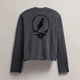 The Grateful Dead Intarsia Sweater is made from recycled cashmere fibers. Style details include crew neckline, exposed linking at shoulders, armholes, and neck seam, self start hems. Grateful Dead skull intarsia at center back. Boxy fit. Relaxed fit